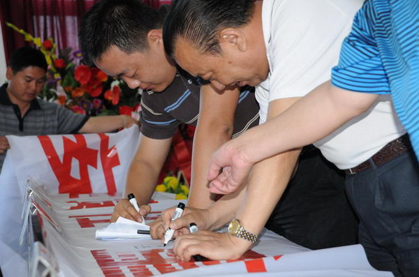 安監(jiān)站領(lǐng)導(dǎo)與董事長在安全宣傳標(biāo)語上簽名 |